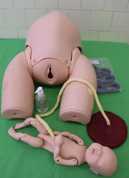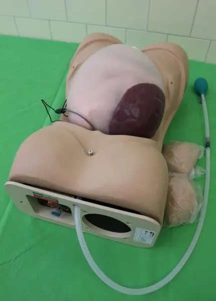 Terhes nő vizsgálatát segítő modell. Leopold-műfogás oktatható a segítségével, beépített hangszórón keresztül pedig magzati szívhangok szimulálhatóak (normál tartomány és bradycardia). |