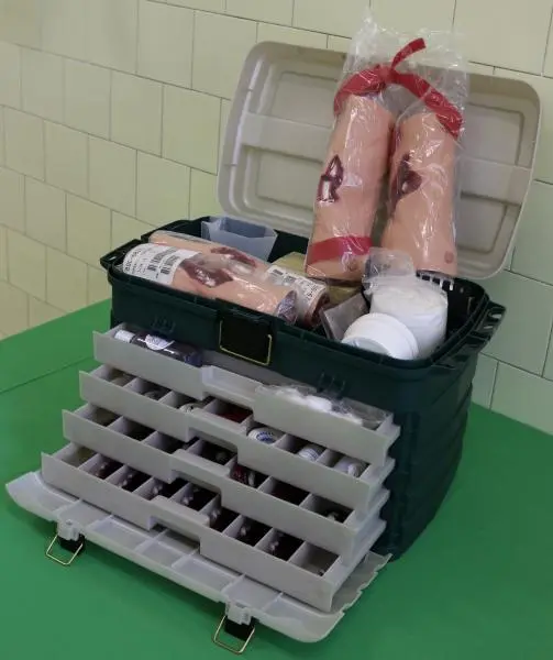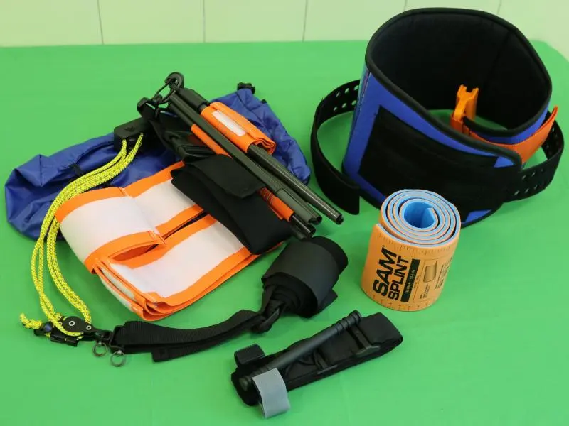 Trauma ellátáshoz szükséges eszközök különféle méretben (Stiffneck, Schanz-gallér, Cramer-sín, SAM splint, medencerögzítő, láb húzósín és érszorító tourniquet) |